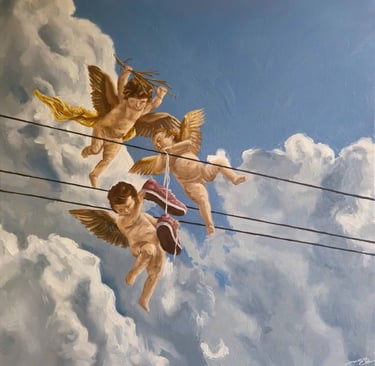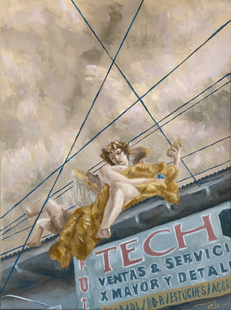 “A principios del verano, visité el cerro San Cristóbal. Había unas plumas de grúa gigantes casi llegando a la cima y, para mi sorpresa, ninguna persona operaba la maquinaria. En su lugar, un trío de ángeles elevaba y sostenía el gran brazo de metal. ¿Quién lo hubiera imaginado? Ayer en el plano celestial y ahora siendo cómplices del triunfo material."